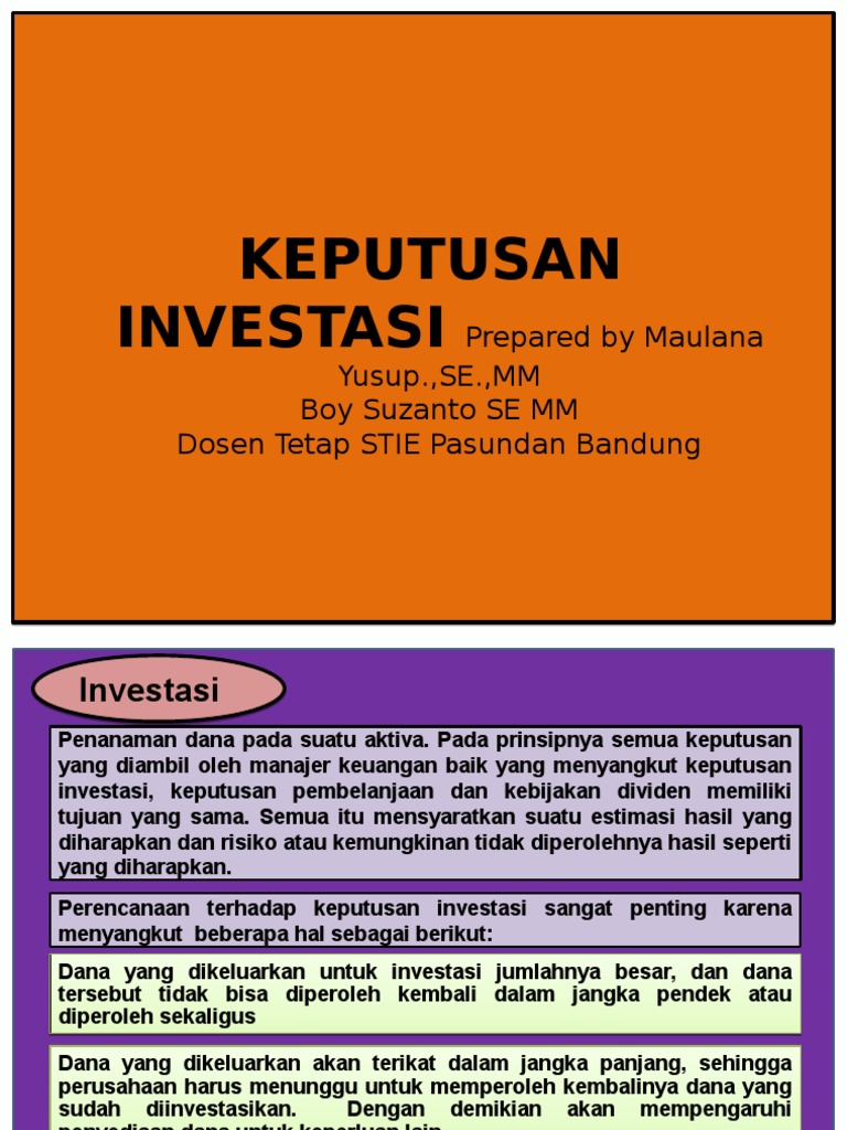 Keputusan investasi adalah langkah kebijakan korporasi untuk mengeluarkan modal saat ini dengan harapan akan menghasilkan modal yang lebih besar dimasa mendatang. = pv q + pv s = rp 500 juta + rp 500 juta = rp 1 m. Keputusan investasi merupakan keputusan atau pilihan atas suatu skenario tingkat keuntungan yang diharapkan kelak juga adanya tingkat resiko yang siap ditanggung.